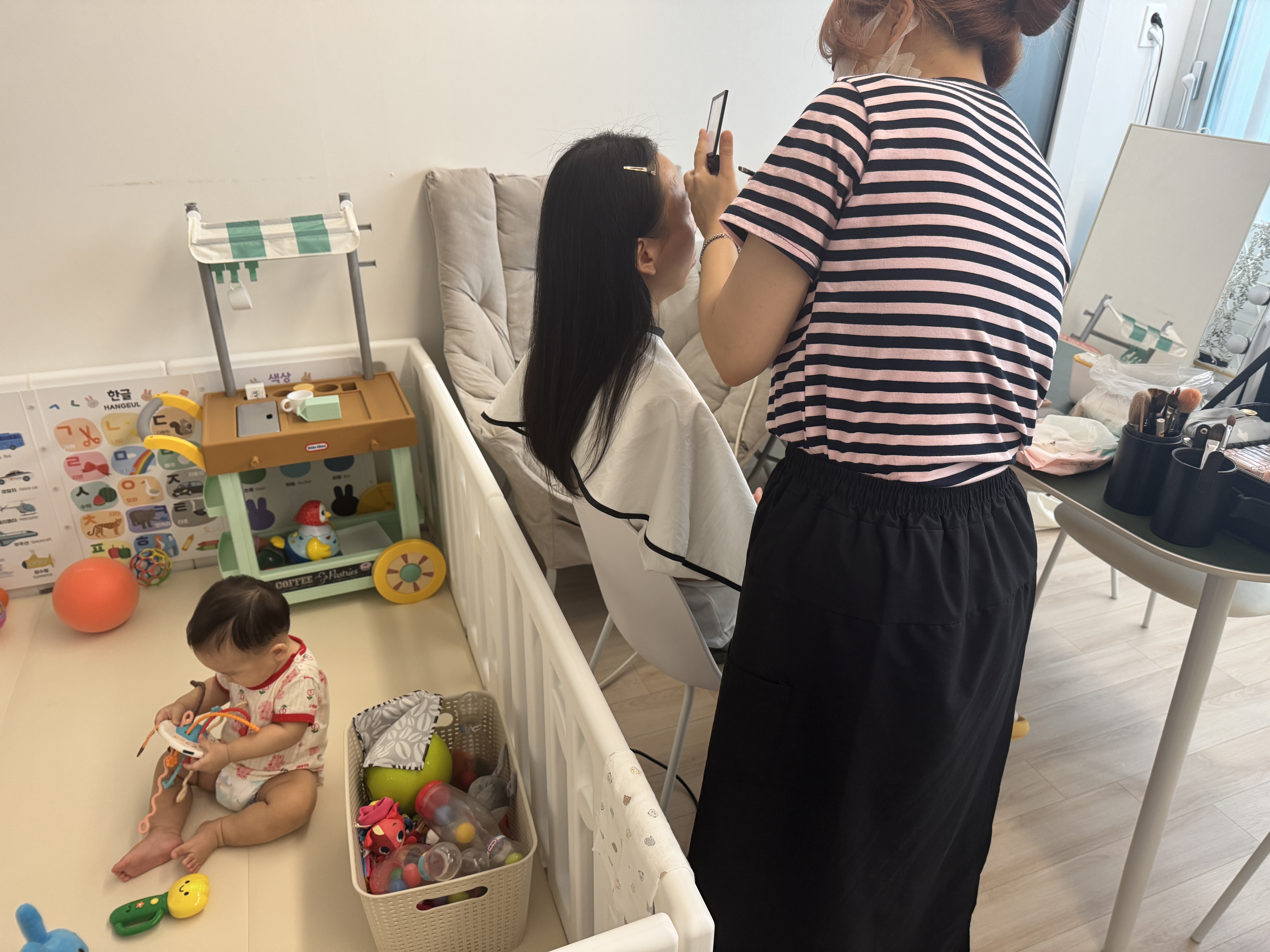아침 일찍 준비를 시작하는데 아직 아기가 어려서 걱정이 되기도 했지만, 다행이 아빠가 놀아주는 시간에 울지 않고 잘 놀아준 아들 덕분에 메이크업 받는 시간동안 정신 없지 않았네~~ㅎㅎ